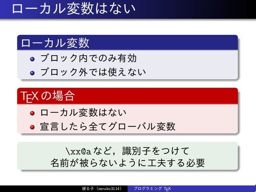 先日の記事では、「TeX 言語がフリーフォーマットでない」ことを述べた。その時に紹介した「例のスライド」では、TeX 言語の(プログラミング言語としての)特徴として次の 3 つを挙げている。 フリーフォーマットではない ローカル変数はない 「関数」はな…